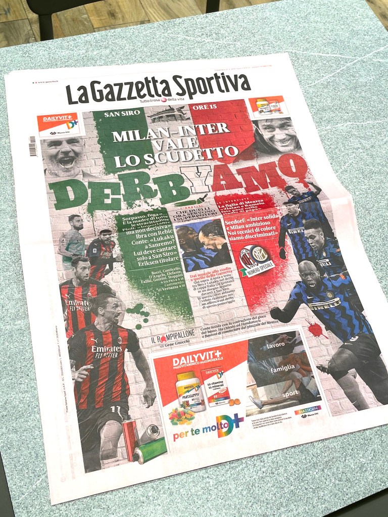 Endlich wieder richtiges Fußballfieber! Die Gazzetta dello Sport veröffentlicht gleich mal 18 Sonderseiten zum Derby Milan-Inter, denn es ist schließlich der Zweite gegen den Ersten – und das hat es wegen der langjährigen Juve-Dominanz ewig nicht mehr gegeben. Außerdem gab es vor einigen Wochen im Pokalspiel der beiden Teams ein heftiges Aufeinandertreffen zwischen den Stürmerstars Romelu Lukaku und Zlatan Ibrahimovic, das kurz vor einer Schlägerei endete. Es war also alles gewürzt und angerichtet.