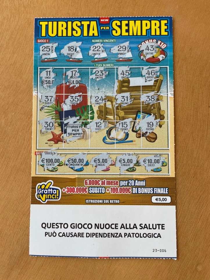 Hier in Italien spielt so gut wie jeder Lotto oder kauft sich Rubbellose. Dieses Freirubbeln der Felder mit einer Münze hat einen ganz besonderen Charme. Mein Lieblingsspiel ist »turista per sempre« (Tourist für immer): Der Hauptgewinn besteht aus 300.000 Euro sofort, 6000 Euro jeden Monat für die nächsten 20 Jahre und zum Abschluss noch einmal 100.000 Euro. Was ich daran mag: Man ist mit dem Gewinn nicht überfordert und kann sich sein Leben gemütlich einrichten, ohne Unsinn anzustellen. Wer auf einen Schlag 156 Millionen Euro auf dem Konto hat, kann doch vor Stress nicht mehr schlafen!