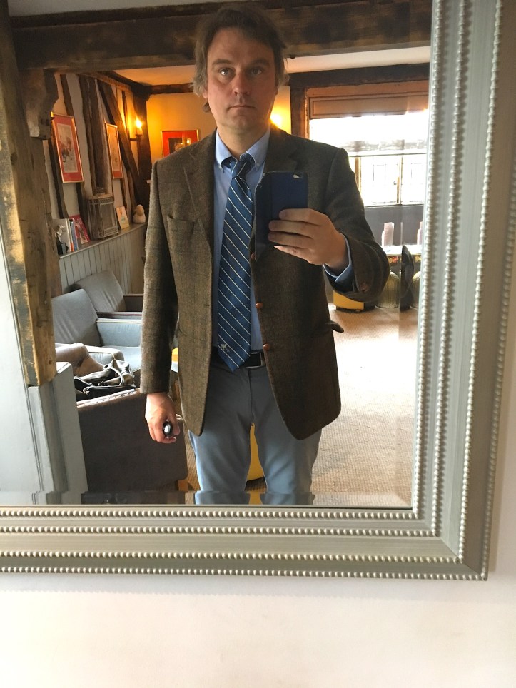 Ein Nachtrag zur letzten Wochenschau und dem Krawattenproblem: Hier seht ihr mich, wie versprochen, in England, kurz bevor ich das Hotelrestaurant betreten durfte. Ihr erkennt: Ich habe einfach kein Krawattengesicht.