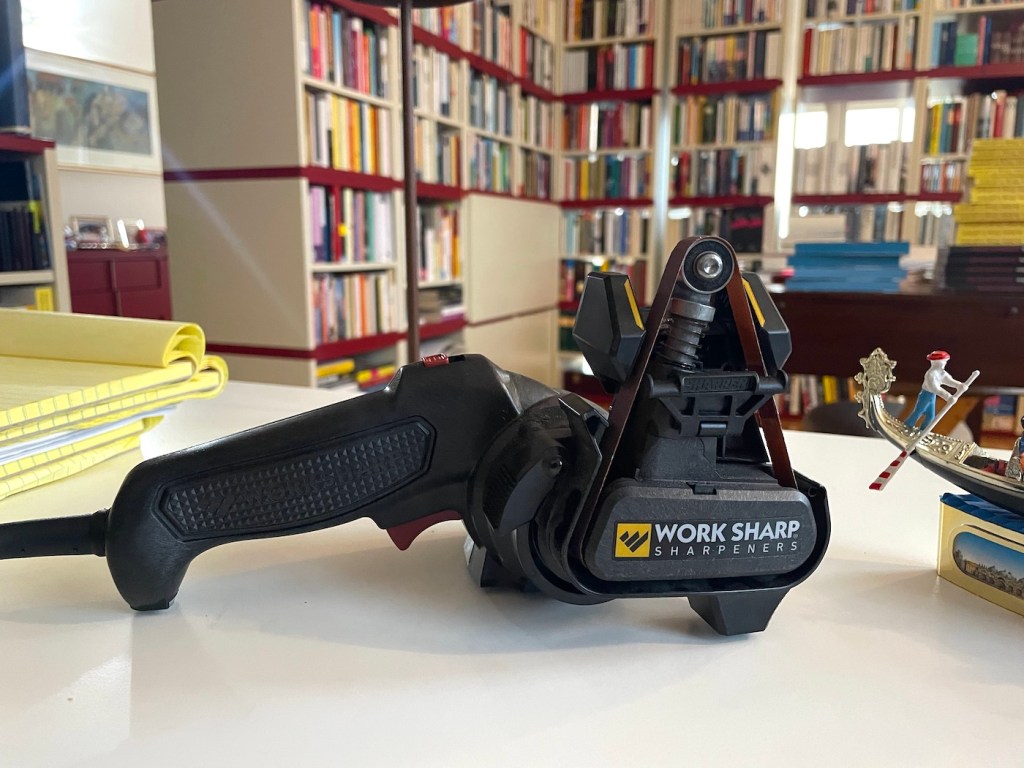 Ich habe mir ein Messerschleifgerät gekauft, aber mich wegen meiner zwei linken Hände wochenlang nicht rangetraut. Dann habe ich es doch getan und alle Messer im Haus aber sowas von scharf geschliffen, ob sie wollten oder nicht. Was für einen Spaß das machte! Sogar der Wechsel der Schleifbänder mit unterschiedlicher Körnigkeit gelang mir ohne größere Verletzungen.