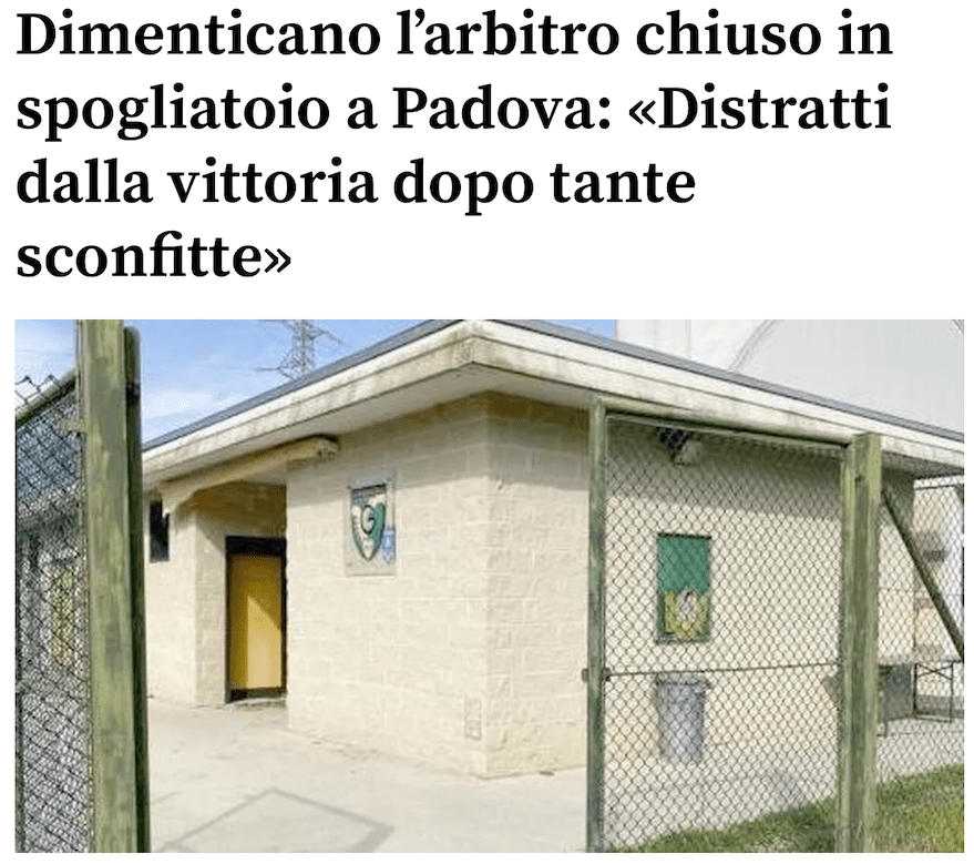 Apropos Fußball: In Venetien ist in einer niederen Amateurliga eine irre Geschichte passiert. Das Team von Grego Padova hat nach dem Spiel den Schiri in der Kabine vergessen – der Mann blieb stundenlang eingeschlossen. Der Präsident entschuldigte sich: Nach so vielen Niederlagen in der letzten Zeit habe man den Sieg umso euphorischer gefeiert.