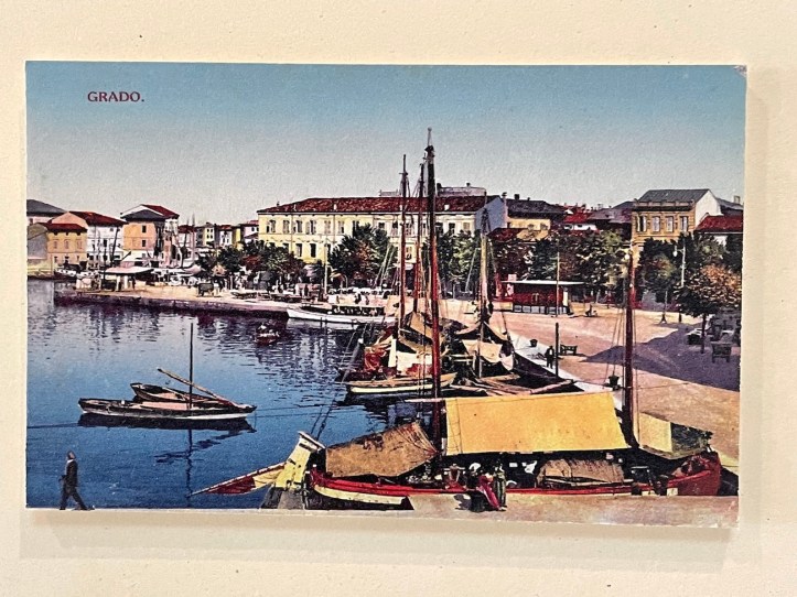 Die Ausstellung der historischen Postkarten in Grado ist wirklich sehenswert. Zumindest dann, wenn ihr gute Augen habt, denn die Exponate hängen in einem sehr dunklen, fensterlosen Raum am Haupteingang des Strandes. Dort bleiben sie noch bis zum September, ihr müsst euch also nicht hetzen und das Eis vom Vizeeisweltmeister so schnell schlecken, dass ihr Kopfweh bekommt.