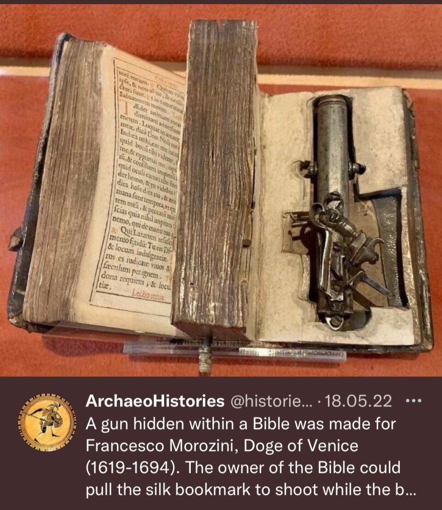 Bevor es an den Strand geht, reisen wir ins Venedig des 17. Jahrhunderts. Schulfreund Robert P. schickte mir ein Foto der Geheimwaffe des Dogen Francesco Morosini (sic!), versteckt in einer Bibel. Der Doge musste nur am seidenen Lesezeichen ziehen, um die Waffe auszulösen.