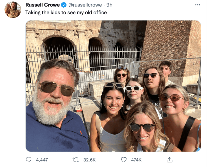 Und wo wir gerade in Rom sind: Heute kam dieser lustige Tweet von Russell Crowe (»The Gladiator«).