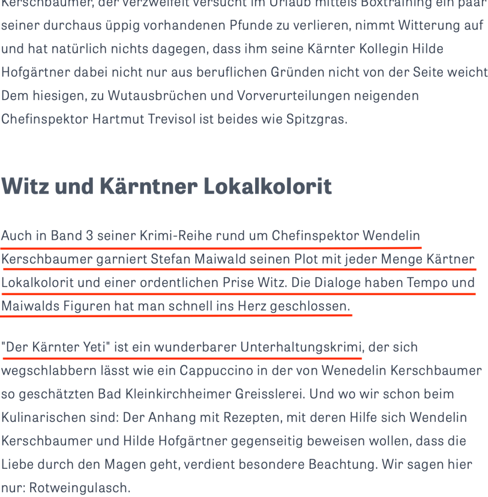 Neue Rubrik: Yeti-Sichtung der Woche. Schickt mir eure Fotos! Das Buch im Wald, in den Bergen oder auch ganz woanders – beim Aperitif, mit Kärntner Spezialitäten oder am Karibikstrand. Ich verlose unter allen Einsendungen ein mächtiges Buchpaket.