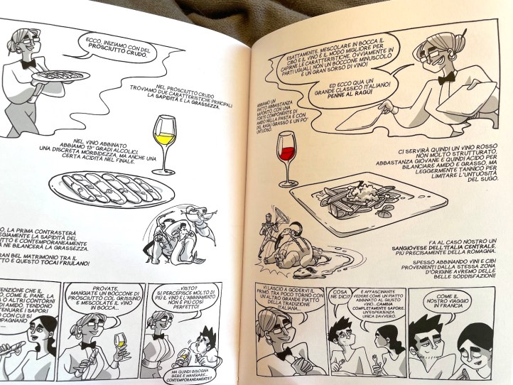 Und hier kommt ein ungewöhnlicher Buchtipp: ein Wein-Lehrbuch als Comic – eine ganz starke Idee. Das Buch heißt »Conoscere il vino« und begleitet ein junges Paar auf ihrer Reise durch die Weinwelt. Wir erfahren, wie Weiß- und Rotwein produziert werden, was Prosecco und Champagner voneinander unterscheidet, wie man junge und alte Weine schon im Glas erkennt, warum welche Weine zu welchen Gerichten besonders gut passen und vieles mehr. Wirklich eine feine Sache. Es ist auf Italienisch, aber der Kauf lohnt sich dennoch, weil das Italienisch gut verständlich ist.