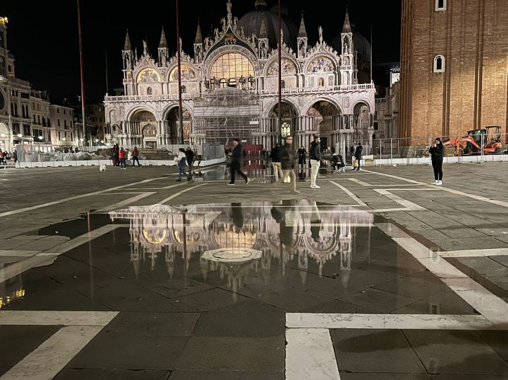 Der Markusplatz ist der am tiefsten gelegene Punkt Venedigs und läuft als erster mit Wasser voll. Influencer lieben die Spiegelungen, ich musste sie regelrecht aus dem Bild scheuchen, so wie die Tauben.