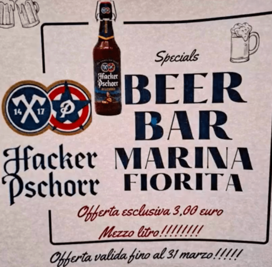 Vom neuen Fitnessstudio hatte ich ja berichtet, und nebenan befindet sich die Bar Marina Fiorita, in der ich – neben Pino – ebenfalls sehr gern bin. Zwischen beiden Betrieben gibt es ein heftiges Ringen um die Seelen der Kundschaft. Denn während das Gym mit immer neuen Fitnesskursen wirbt, läuft in der Bar Marina Fiorita noch bis zum 31. März eine Sonderaktion, die mit großen Plakaten beworben wird: ein halber Liter Hacker-Pschorr-Bier kostet nur drei Euro.
