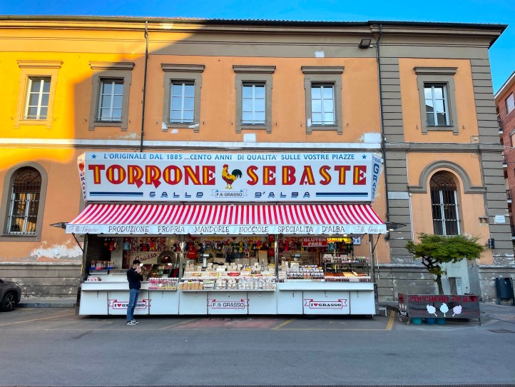 Hier gewann übrigens ein Rubbellos 36.600 Euro, wie der gelbe Aushang stolz berichtet. Im Hintergrund: der berühmte Dom von Alba.