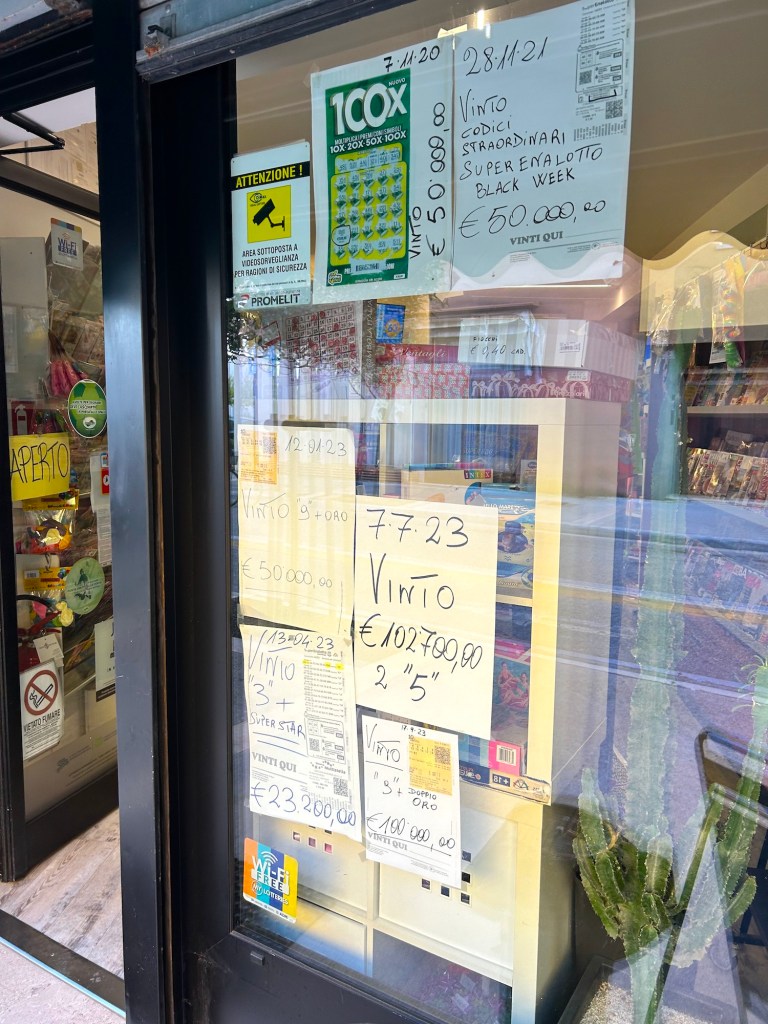 Italiener sind abergläubisch und glauben fest an Glücksorte; Fotokopien der Gewinnlose hängen stolz am Eingang. Während ich diese Zeilen schreibe (in Pinos Enoteca, wie es sein muss), diskutieren die Gäste am Nebentisch bei einem Glas Wein über den Geldsegen. Natürlich ändern weder 50.000 Euro noch 100.000 Euro wirklich und grundlegend das Leben. Aber, naja – ein bisschen schon, gerade in Italien, wo das ja noch richtige Summen sind.