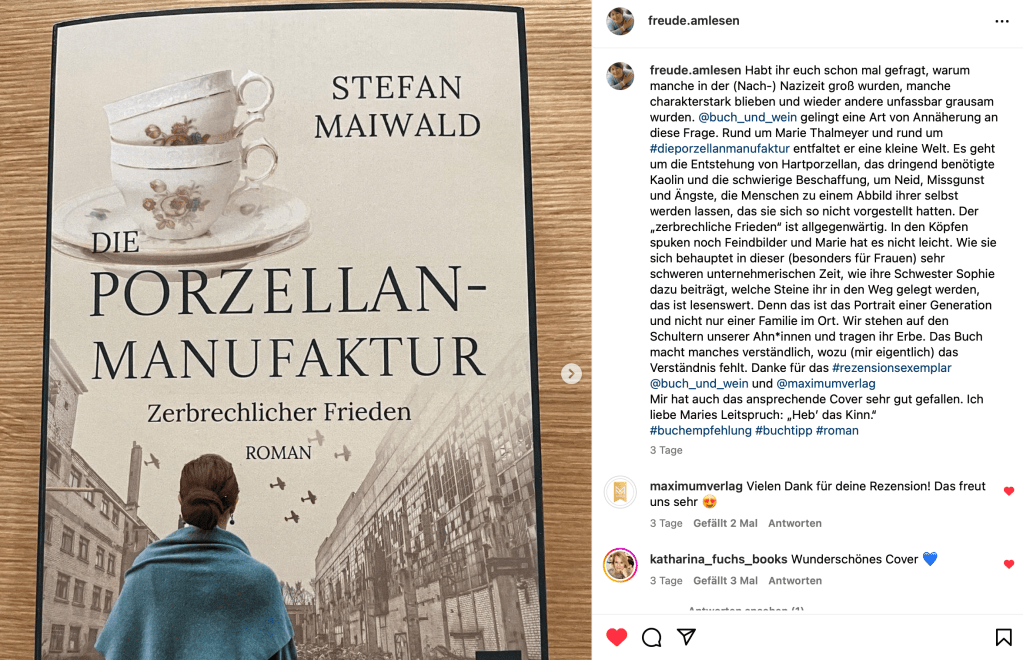 Die Buchbloggerin @freude.amlesen war meine erste Rezensentin. Ich brauchte zwei Stunden, bis ich mich überwinden konnte, ihre Zeilen zu lesen.