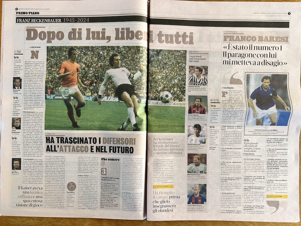 Gestern am späten Nachmittag kam die Meldung vom Tod Franz Beckenbauers, und die Gazzetta dello Sport hat in wenigen Stunden mächtig auf die Tube gedrückt und die Titelseite und die ersten sieben Seiten dem Kaiser gewidmet.