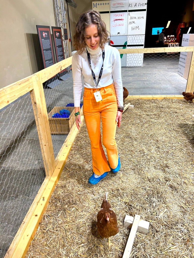 Und: Ich erzähle euch ja selten von meinen Töchtern, aber diese Anekdote muss ich jetzt doch mal loswerden. Meine älteste Tochter studiert Deutsch und Literatur in Padua. Da muss sie die ganzen Klassiker im Original lesen; schwere Kost, zumal ihre Muttersprache Italienisch ist. Sie kam für einen Tag zur Messe nach Florenz und durfte zu den Hühnern in den dort aufgebauten Stall (es handelte sich eigentlich um eine Kunstinstallation – aber eben mit echten, artgerecht gehaltenen Tieren), und sie erzählte in unserer deutschen Journalistenrunde später, sie habe versucht, die Hühner zu »liebkosen«. Sie meinte natürlich »streicheln«.
