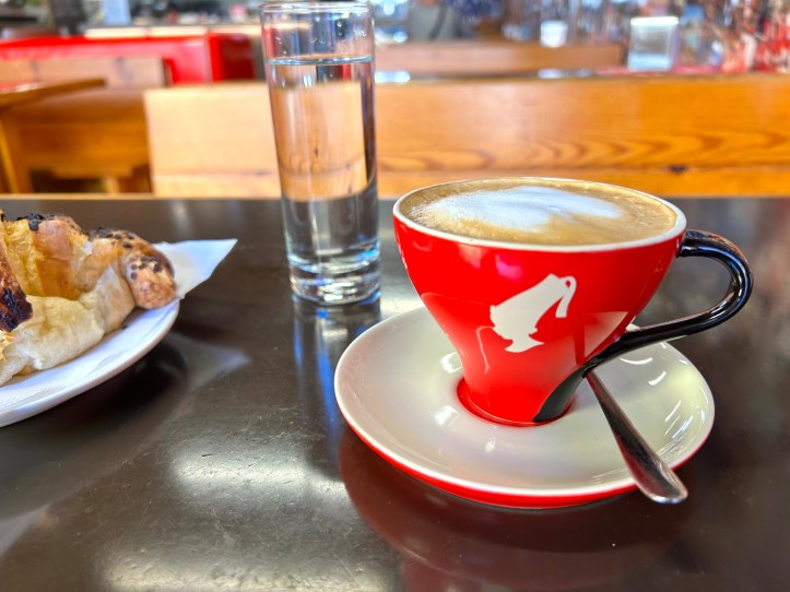 Gibt es jetzt etwa auch den Kaffee dieser Marke dort? Nein, die hübschen Tassen stammen aus den Restbeständen einer aufgelösten Bar.