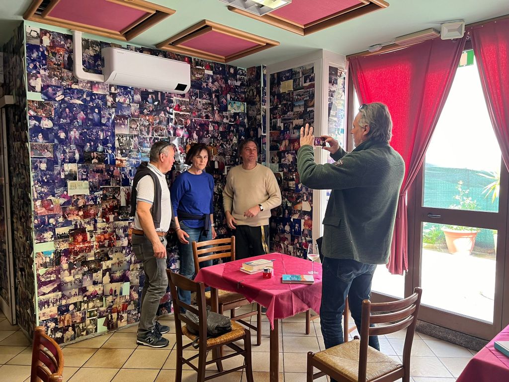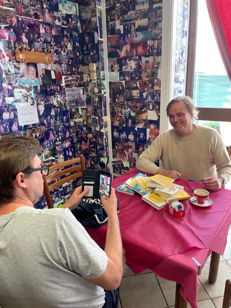 Leserin Eva im Hintergrund lacht, weil meine Schwiegermutter mir extra ein schönes Hemd für die Signierstunde geschenkt hat und mich nun dafür tadelt, es nicht angezogen zu haben. Ja, ihr Lieben, so ist das Leben in einer italienischen Familie. Da kannst du fast so viele Bücher verkaufen wie der Papst und musst dich trotzdem für deine Garderobe tadeln lassen.