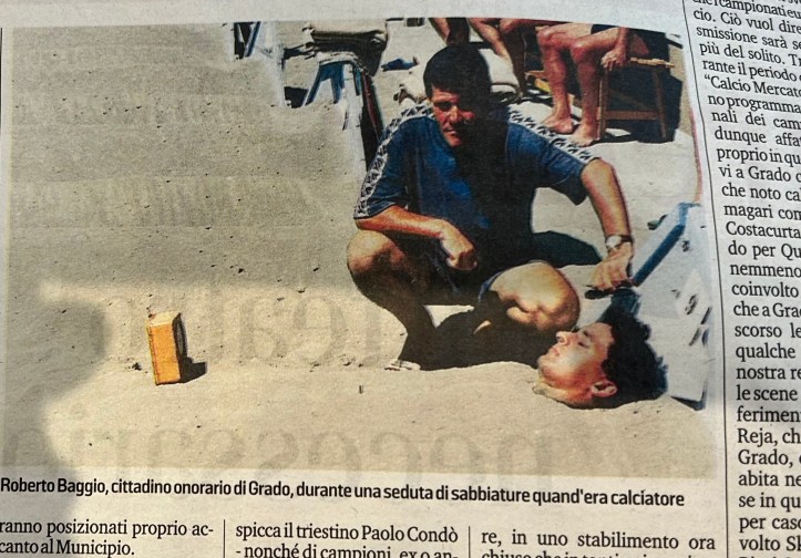 Roberto Baggio, inzwischen Ehrenbürger von Grado, ist im Sand eingebuddelt.