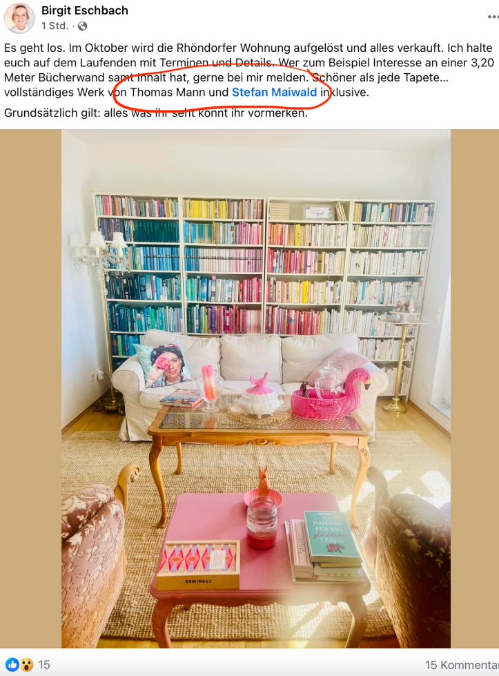 Die wunderbare Podcasterin Birgit Eschbach zieht um. Wer Interesse an dem einen oder anderen Gegenstand hat, möge sich bei ihr melden.