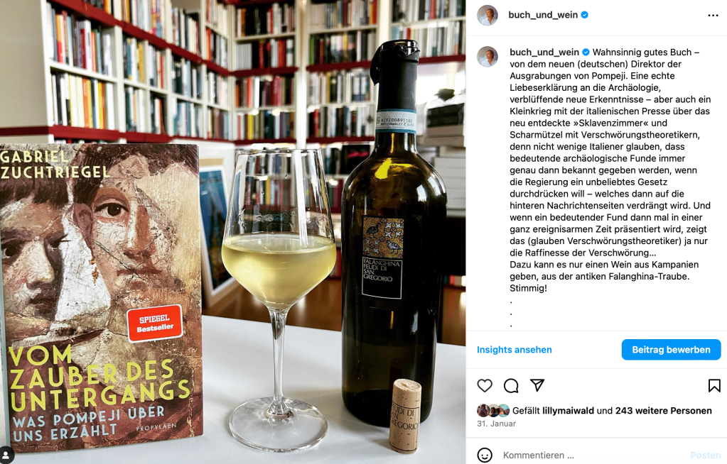 Das waren jetzt ganz frech meine Bücher. Auf meiner Instagram-Seite (@buch_und_wein) habe ich aber viele weitere Lieblingsbücher aus allen Sparten vorgestellt, vom Sachbuch bis zum Roman, vom Klassiker bis zum Newcomer.