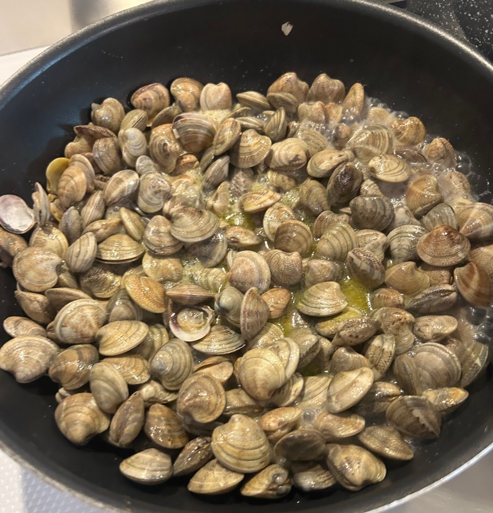Die Erholung habe ich mir auch verdient, denn ich musste ja am Tag zuvor für meinen Schwiegervater Spaghetti vongole zubereiten. Wie das ausgegangen ist? Den Film dazu (ich kann ihn hier leider nicht einbinden) plus Kommentar des Schwiegervaters gibt es auf meinem Instagram-Account @buch_und_wein.