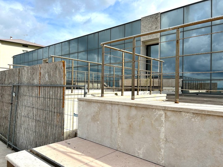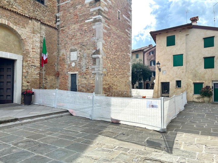 Der Campanile, das Wahrzeichen Grados, bröckelt weiter vor sich hin; bald ist wohl eine größere Restaurierung fällig. Damit die Gläubigen endlich wieder durchs Hauptportal in die Basilika schreiten dürfen, wird in dieser Woche ein Fußgängertunnel errichtet, der vor herabstürzenden Steinen schützen soll, eine Art eingerüsteter Laubengang. So können Flaneure den Kirchplatz auch wieder aus Richtung Rathaus erreichen; der Durchgang ist ja derzeit gesperrt.