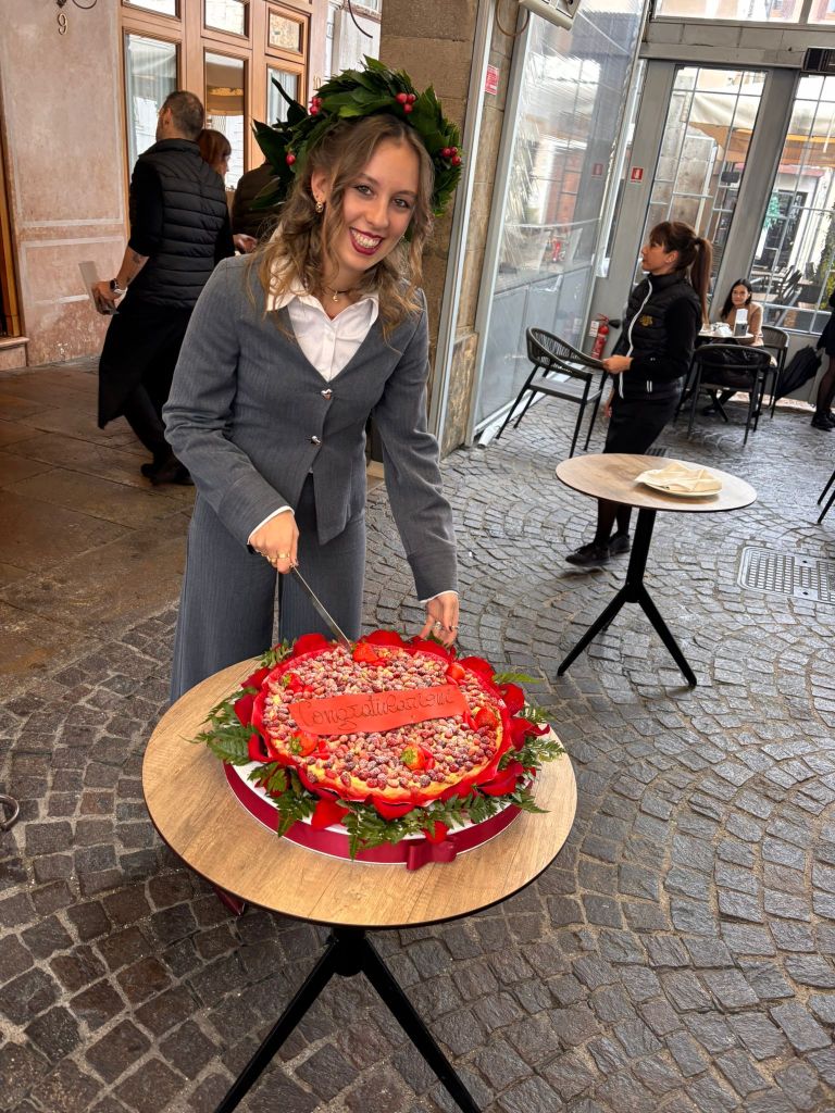 Jetzt ist es schon wieder eine Woche her, dass meine Tochter ihren Uni-Abschluss gefeiert hat. Diese Studienabschlüsse sind in Italien eine große (und gesellige) Sache: Der Dottore oder die Dottoressa bekommen einen Lorbeerkranz aufs Haupt, und dann ziehen alle von Bar zu Bar, um mit Freunden und Familie Prosecco zu trinken und Häppchen zu essen. Das nennt sich rinfresco di laurea und ist für die Gastronomen in Studentenstädten wie Padua immer lukrativ.
