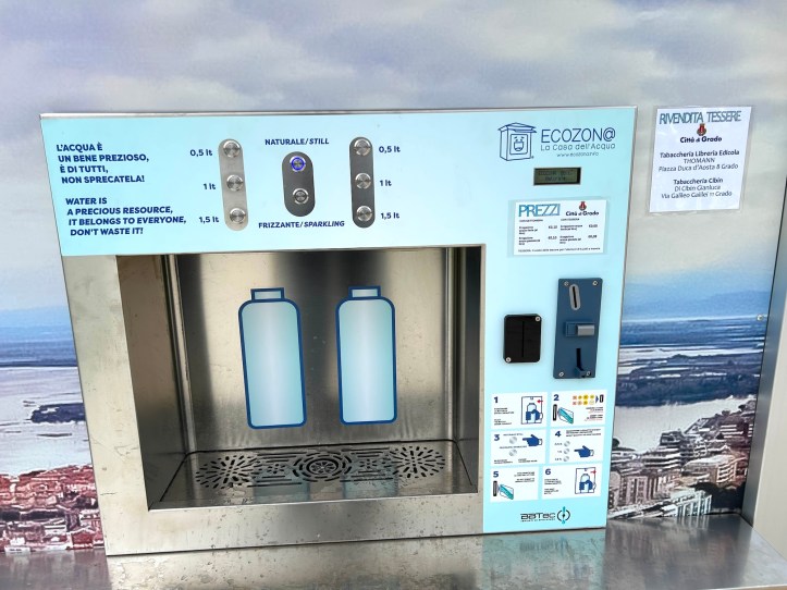 Das Ganze kostet übrigens eine Million Euro, und nach Ostern soll ganz Grado mit den Mülltonnen bestückt werden. Ich habe in den letzten Wochen keinen einzigen Gradeser getroffen, der die smarten Mülltonnen für eine gute Idee hält; es überwiegt heftiges, ja fassungsloses Kopfschütteln.